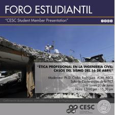 El objetivo general de esta actividad es desarrollar un foro estudiantil - profesional de conversación acerca del Código de Ética de la ASCE (Sociedad Americana de Ingenieros Civiles), una de las sociedades miembros de ABET, aplicado a casos de sismos en Pedernales en base a investigaciones realizadas por los miembros de CESC-ESPOL.