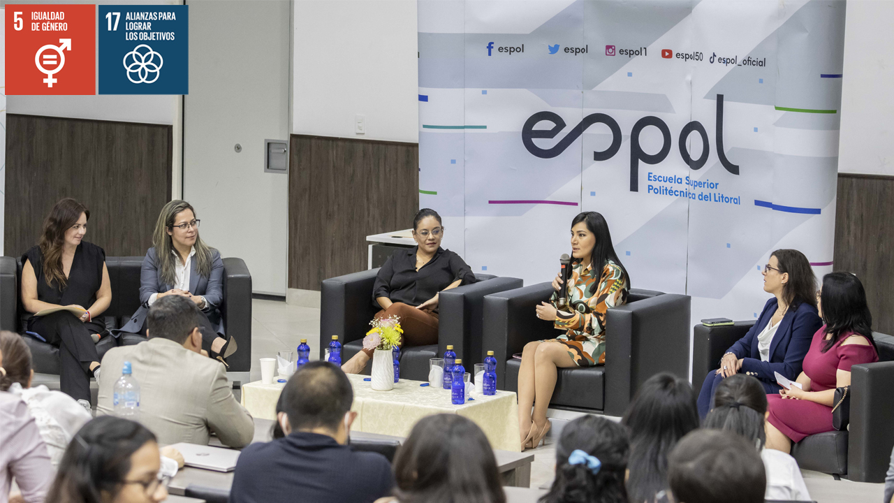 Luego de su intervención, inició el conversatorio Género y Energía con la participación de Enith Carrión, viceministra de Electricidad y Energía Renovable (e); Paola Romero, decana de la Facultad de Ingeniería en Ciencias de la Tierra (FICT); Ángela Albán, subsecretaría de Pequeña Minería y Minería Artesanal; Alejandra Fonseca, representante de Schlumberger e Iliana Rodríguez, vicepresidente de Recursos Humanos de Lundin Gold.